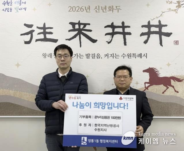 (케이엠뉴스) 영통구 영통1동은 지난 9일 한국지역난방공사 수원지사가 설 명절을 맞아 영통1·2·3동 행정복지센터에 각각 온누리상품권 100만 원씩을 기탁했다고 밝혔다.