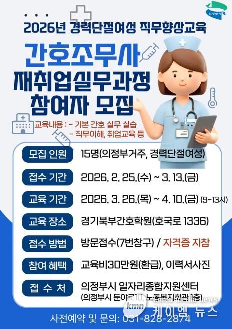 (케이엠뉴스) 의정부시는 관내 경력단절여성 구직자를 위한 맞춤형 직업교육으로 ‘간호조무사 재취업 실무과정’ 참여자를 모집한다.