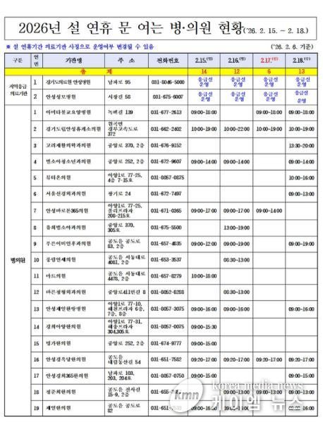 (케이엠뉴스) 안성시는 설 연휴 기간(14일~18일, 5일간) 동안 의료 공백을 최소화하고 응급 상황에 신속히 대응하기 위해 ‘응급진료 상황실’을 운영한다고 밝혔다.