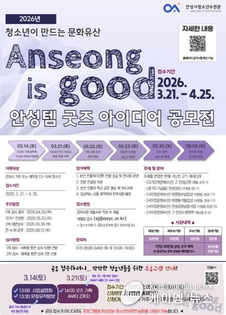 (케이엠뉴스) 안성시청소년수련관은 청소년이 지역 문화유산을 창의적인 굿즈로 재해석하는 '2026 청소년이 만드는 문화유산 ‘안성템 굿즈 아이디어 공모전’'을 개최하고, 오는 3월부터 참가 청소년을 모집한다고 밝혔다.