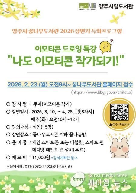 (케이엠뉴스) 양주시 꿈나무도서관이 2026년 특화주제 프로그램으로 성인 대상의 ‘이모티콘 드로잉 특강’을 3월 10일부터 8주간 운영한다.