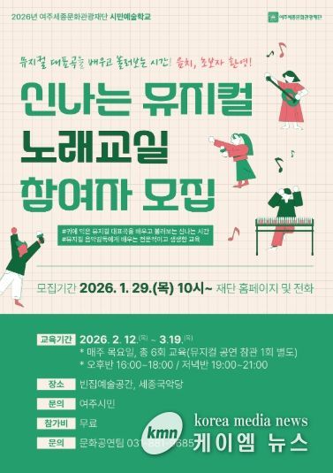 (케이엠뉴스) 여주세종문화관광재단은 오는 12일부터 시민예술학교 프로그램의 일환으로 ‘신나는 뮤지컬 노래교실’을 운영한다.