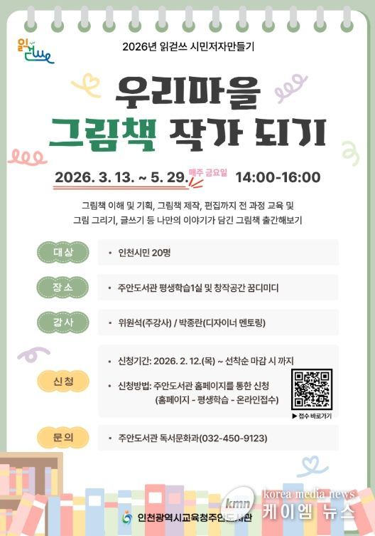 (케이엠뉴스) 인천광역시교육청주안도서관은 읽걷쓰 시민저자 양성을 위한 ‘우리마을 그림책 작가 되기’ 프로그램 참여자를 모집한다.