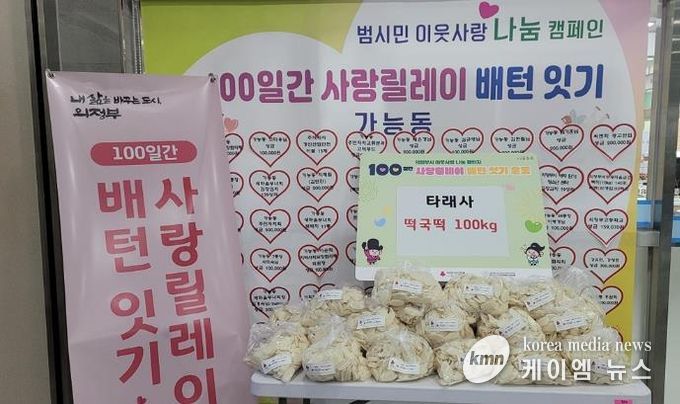 (케이엠뉴스) 의정부시 가능동주민센터는 2월 9일 한국불교태고종 타래사가 떡국떡 100kg를 기탁했다고 밝혔다.