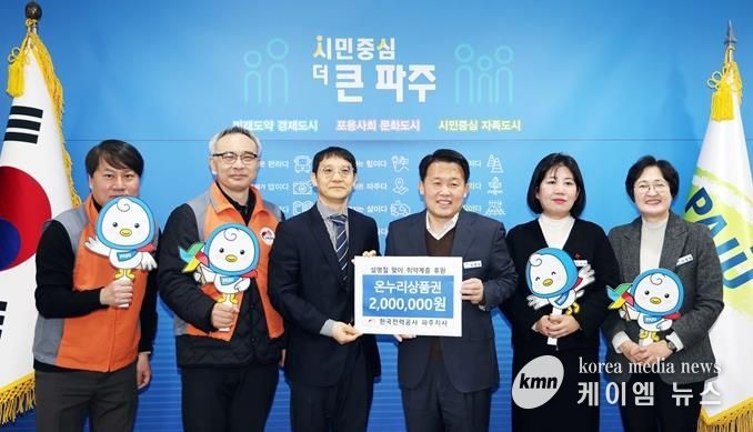 (케이엠뉴스) 파주시는 11일 한국전력공사 파주지사가 설맞이 저소득 취약계층을 위한 온누리상품권 200만 원을 전달했다고 밝혔다.