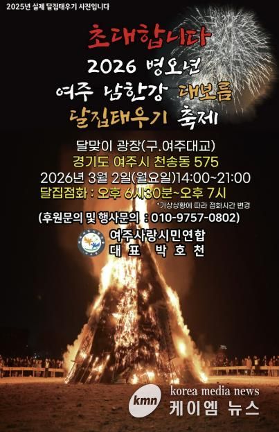 (케이엠뉴스) 여주시는 여주사랑시민연합 주관으로 오는 3월 2일 오후 2시 달맞이 광장(연인교 아래/경기도 여주시 천송동 575)에서 정월대보름을 맞아 전통 세시풍속 행사인 ‘달집태우기’ 행사를 개최한다고 밝혔다.