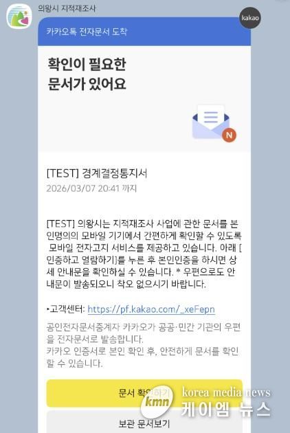 (케이엠뉴스) 의왕시가 지적재조사 통지서를 스마트폰으로 발송하는 ‘모바일 전자고지 시스템’을 본격적으로 시행한다.