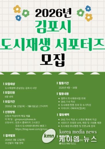(케이엠뉴스) 김포시는 다양한 도시재생사업을 홍보하고 도시재생에 대한 시민들의 이해와 관심을 도모하고자 오는 12일부터 ‘2026년 김포시 도시재생 서포터즈’를 모집한다.