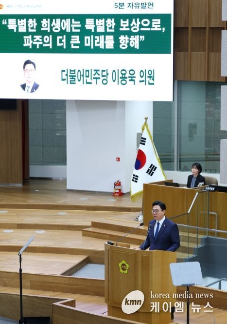 (케이엠뉴스) 경기도의회 경제노동위원회 이용욱 의원(더불어민주당, 파주3)이 12일 열린 제388회 임시회 제4차 본회의에서 5분 자유발언을 통해, 70년 넘게 안보를 위해 희생해 온 파주시민에게 정부가 미군 반환공여지를 조속히 무상 양여할 것을 강력하게 촉구했다.