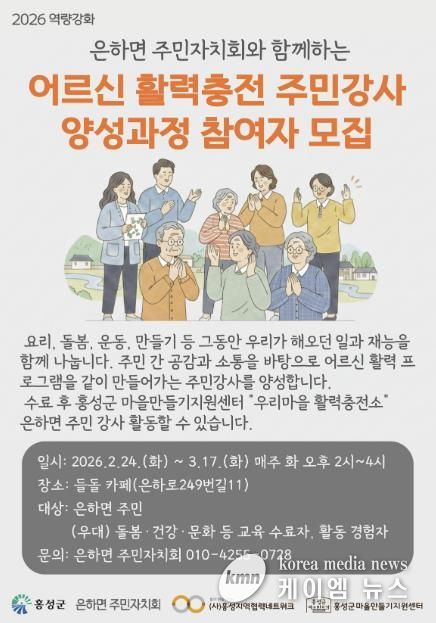 (케이엠뉴스) 홍성군 은하면 주민자치회는 홍성군 마을만들기 지원센터와 함께 지역 내 어르신 돌봄과 마을 공동체 활성화를 위해 ‘어르신 활력충전 주민강사 양성과정’ 참여자를 모집한다.