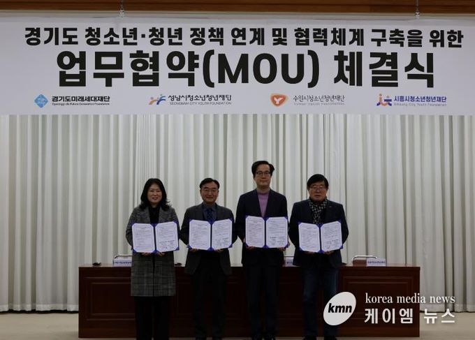 (케이엠뉴스) 경기도미래세대재단은 12일 옛 경기도청사 신관 4층 대회의실에서 수원·성남·시흥시청소년청년재단과 ‘경기도 청년 정책 연계 및 협력체계 구축 업무협약’을 체결했다.