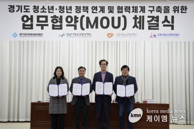 (케이엠뉴스) (재)시흥시청소년청년재단은 지난 2월 12일 경기도청 옛청사 신관 4층 대회의실에서 경기도미래세대재단, 수원시청소년청년재단, 성남시청소년청년재단과 함께 ‘청소년ㆍ청년 정책 연계 및 협력체계 구축’을 위한 업무협약을 체결했다.