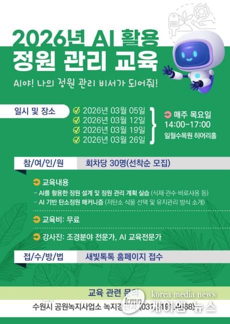 (케이엠뉴스) 수원특례시는 시민 정원가의 전문성을 높이고 스마트한 정원 문화를 확산하기 위해 ‘인공지능(AI) 활용 정원 관리 교육’을 운영한다.