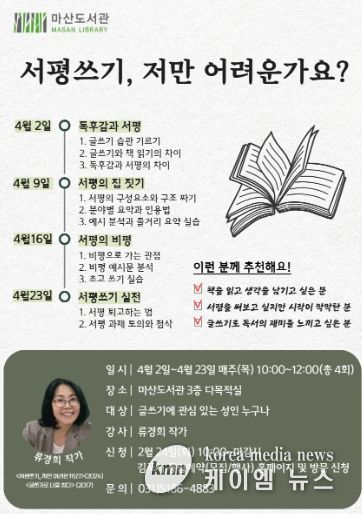 (케이엠뉴스) 김포시 마산도서관은 오는 4월 2일부터 23일까지 매주 목요일 오전 10시부터 12시까지 성인 대상 글쓰기 특강 ‘서평쓰기, 저만 어려운가요?’를 운영한다.
