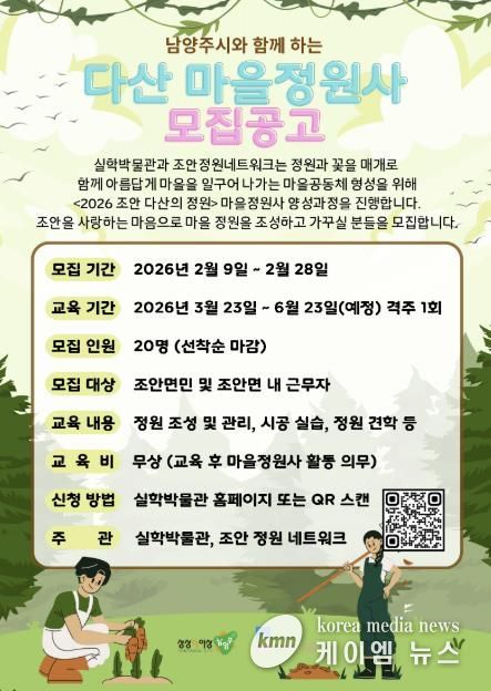 (케이엠뉴스) 경기문화재단 실학박물관과 조안정원네트워크는 '2026 조안 다산의 정원' 마을정원사 양성과정을 운영한다. '2026 조안 다산의 정원'은 경기도 마을정원 조성사업과 연계해, 실학박물관 다산정원 내 활용도가 낮은 공간에 커뮤니티 정원을 조성하고, 마을정원사 양성을 통해 정원문화를 지역으로 확산하는 것을 목표로 한다.