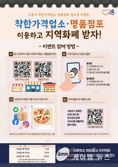 이번 이벤트는 기간 내 시민이 착한가격업소 또는 명품점포를 이용한 뒤 개인 사회관계망서비스(SNS)에 이용 후기를 게시하고, 시흥시 누리집 새소식과 시루 앱(App)에 게시된 홍보물의 정보무늬(큐알코드)를 통해 네이버 폼에 접속해 방문 후기와 영수증을 제출하는 방식으로 진행된다. 시는 참여자 가운데 무작위 추첨을 통해 총 142명에게 지역화폐 모바일 시루를 지급할 예정이며, 당첨자는 오는 3월 18일 개별 통보한다.