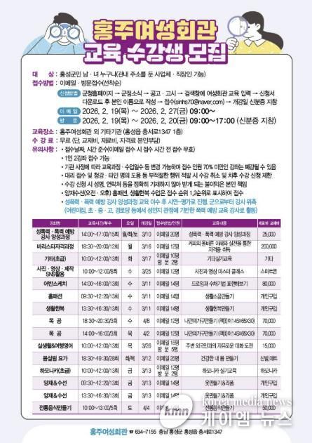 (케이엠뉴스) 홍성군 홍주여성회관이 군민들의 자격 취득과 창업을 돕는 ‘2026년 상반기 교육과정’ 수강생을 모집한다.