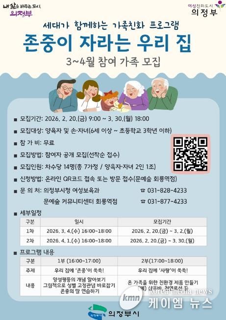(케이엠뉴스) 의정부시는 문예숲 커뮤니티센터 회룡역점(회룡역사 3층)에서 운영하는 ‘존중이 자라는 우리 집’ 프로그램 참여 가정을 2월 19일부터 선착순으로 모집한다.