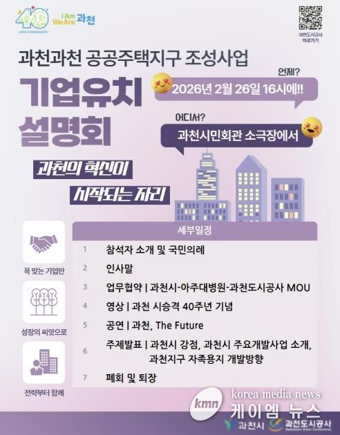 (케이엠뉴스) 과천시와 과천도시공사는 오는 2월 26일 오후 4시 과천시민회관 소극장에서 ‘과천과천 공공주택지구 기업유치 설명회’를 개최한다고 밝혔다.