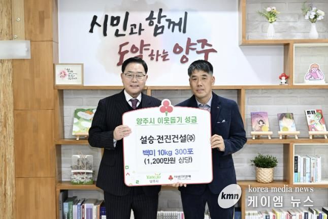 (케이엠뉴스) 양주시가 최근 전진건설㈜·설승건설㈜로부터 이웃돕기 성품으로 백미 10kg 300포(1,200만 원 상당)를 기탁받았다고 밝혔다.