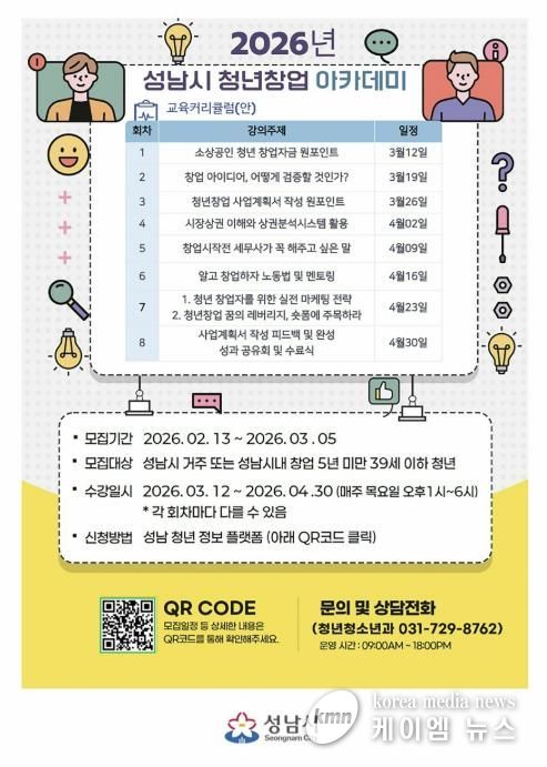 (케이엠뉴스) 성남시는 오는 3월 5일까지 ‘청년창업 아카데미’ 무료 교육생 30명을 모집한다.