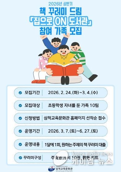 (케이엠뉴스) 삼척교육문화관은 3월부터 6월까지 가족 단위 독서 문화를 장려하기 위하여 초등학생 자녀를 둔 가족을 대상으로 책 꾸러미 드림 ‘집으로 온(ON) 도서관’을 운영한다.