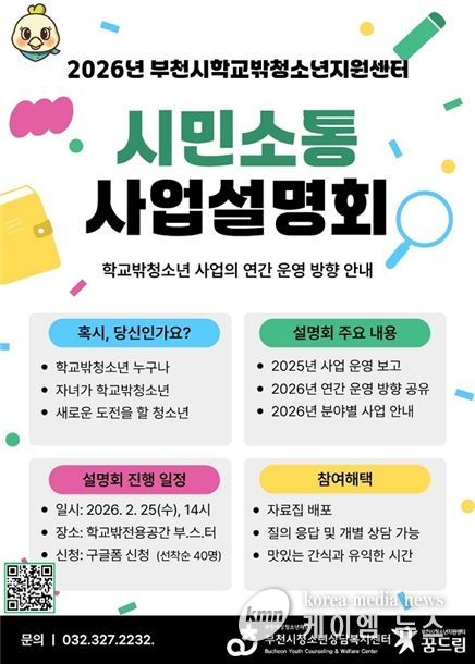 (케이엠뉴스) 부천시학교밖청소년지원센터는 오는 2월 25일, 오후 2시 학교밖청소년 전용공간 부.스.터. (송내어울마당 1층)에서 시민과의 소통을 확대하고 2026년 연간 운영계획을 공유하는 ‘사업설명회’를 개최한다고 밝혔다.