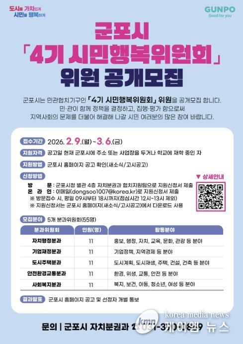 군포시 관계자는 “시민행복위원회는 시민의 아이디어가 정책으로 이어지는 협치의 통로”라며 “군포시의 미래를 함께 설계해 나갈 시민 여러분의 적극적인 참여를 기대한다”라고 밝혔다.