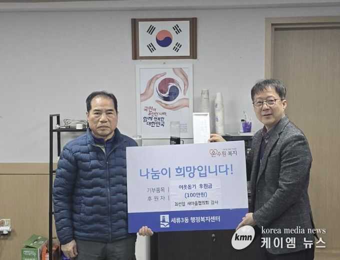(케이엠뉴스) 권선구 세류3동 행정복지센터는 지난 19일, 최선집 세류3동 통장협의회 부회장(겸 새마을지도자협의회 감사)이 어려운 이웃을 위해 써달라며 성금 100만 원을 기부했다고 전했다.