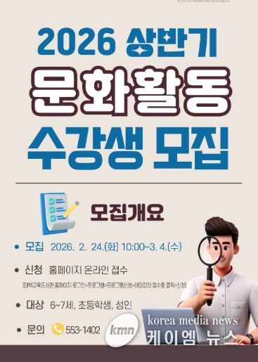 (케이엠뉴스) 태백교육도서관은 3월 18일부터 7월 8일까지 지역 내 유아·초등학생·성인을 대상으로 ‘2026년 상반기 문화활동강좌’를 운영한다.