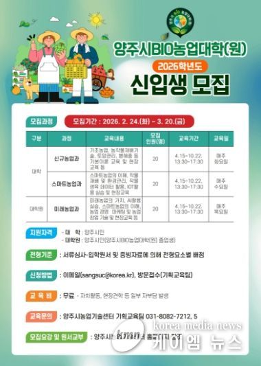 (케이엠뉴스) 양주시가 미래농업을 이끌어갈 핵심 인재 양성을 위해 2월 24일부터 3월 20일까지 ‘2026년도 양주시BIO농업대학(원)’ 신입생을 모집한다.