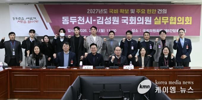(케이엠뉴스) 동두천시는 23일 국회의원회관에서 김성원 국회의원과 '2027년도 국비 확보 및 주요 현안 건의를 위한 실무협의회'를 열고, 지역 발전을 위한 전방위적인 국비 확보 체제에 돌입했다고 밝혔다.