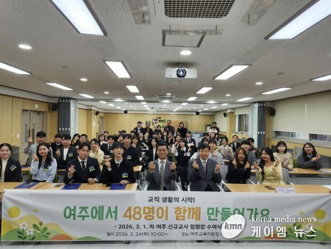 (케이엠뉴스) 경기도여주교육지원청은 2월 24일 여강홀에서 2026학년도 유·초·중등·특수·비교과 신규교사 48명을 대상으로 임명장 수여식을 개최하고, 미래 여주교육을 이끌 새로운 교사들의 힘찬 출발을 알렸다.