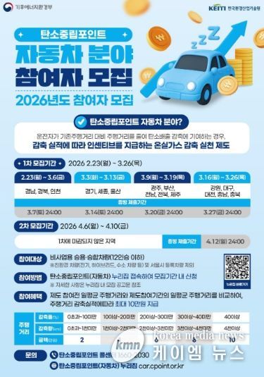 (케이엠뉴스) 고양특례시는 기후위기 대응과 탄소중립 실천 문화를 확산하기 위해 ‘2026년 탄소중립포인트 자동차 분야’ 참여자를 모집한다고 밝혔다.