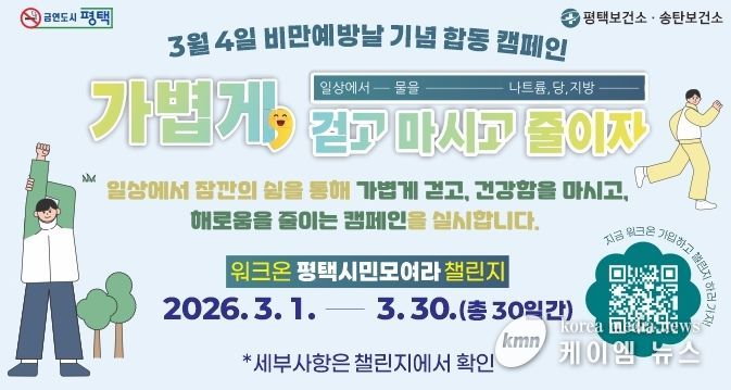 (케이엠뉴스) 평택시는 오는 3월 4일 ‘비만 예방의 날’을 맞아, 3월 한 달간 시민과 함께하는 ‘가볍게 걷고, 마시고 줄이자’ 합동 캠페인을 대대적으로 전개한다고 밝혔다.