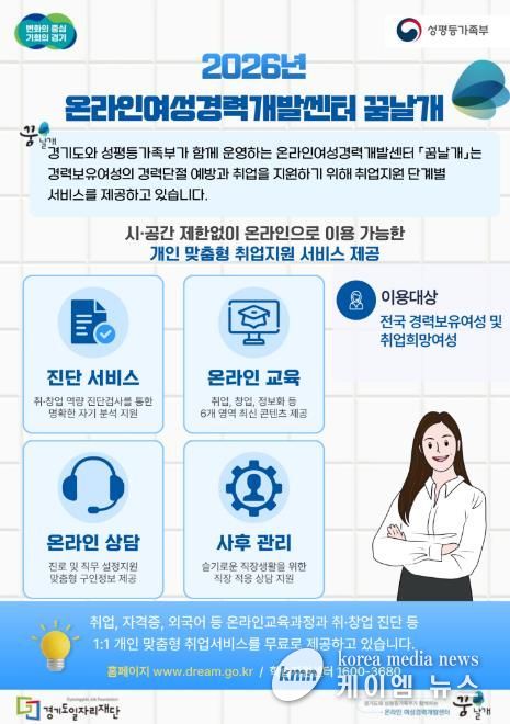 (케이엠뉴스) 경기도가 경력보유여성 등 미취업여성의 경력단절을 예방하고 경제활동 참여를 지원하기 위해 ‘온라인 여성경력개발센터(꿈날개)’ 사업을 추진한다.