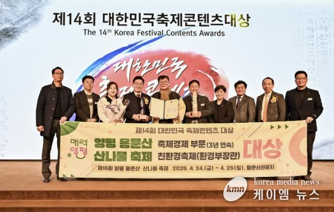 (케이엠뉴스) 양평군은 지난 24일 용산기념관 내 피스앤파크컨벤션에서 개최된 ‘2026년 제14회 대한민국 축제 콘텐츠 대상’ 시상식에서 축제 경제 부문 3년 연속 대상 수상의 영예를 안았다. 또한 국내 최초로 친환경 축제 분야에서 환경부장관상을 수상하며 지속 가능한 축제 운영 성과를 인정받았다.