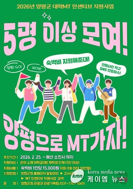 (케이엠뉴스) 양평군은 25일부터 관외 대학생들의 지역 방문을 유도하고 관광 활성화를 도모하기 위해 ‘2026년 양평군 대학 엠티(MT) 인센티브 지원 사업’을 본격 시행한다고 밝혔다.