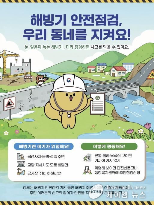 해빙기 안전점검의 주요 항목은 구조물의 균열·침하·세굴·포트홀 등 발생 여부와 비탈면 유실·낙석방지망 훼손 여부 등이다. 경미한 사항은 현지에서 즉시 시정하고, 보수·보강이 필요한 시설은 응급조치(사용제한, 통제선 설치 등) 후 신속히 개선할 예정이다.
