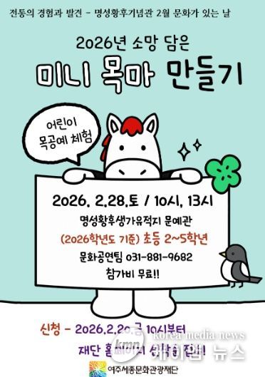 (케이엠뉴스) 여주세종문화관광재단은 오는 2월 28일, 명성황후기념관 2월 문화가 있는 날 프로그램으로 '2026년 병오년 소망을 담은 미니 목마 만들기'를 진행한다.