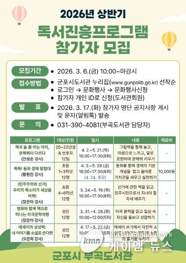 (케이엠뉴스) 군포시 부곡도서관은 지역 주민들에게 올바른 독서 환경을 제공하고 책 읽는 즐거움을 선사하기 위해 ‘2026년 상반기 독서진흥프로그램’을 운영한다고 밝혔다.