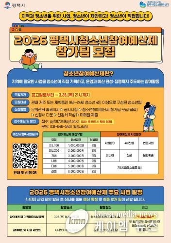 (케이엠뉴스) 평택시가 (재)평택시청소년재단에 위탁 운영 중인 평택시청소년문화센터는 청소년들의 주도적 참여로 이루어지는 ‘평택시청소년참여예산제’ 참가팀을 모집한다.