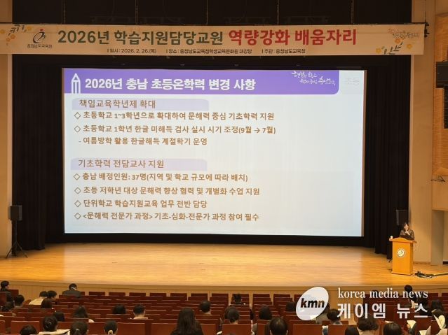 (케이엠뉴스) 충남교육청은 26일 충남교육청학생교육문화원(천안)에서 2026년 학습 지원 담당 교원 410명과 14개 시군 교육지원청 기초학력 담당 장학사를 대상으로 배움자리를 개최했다.