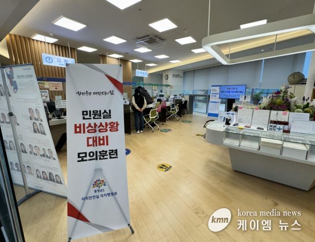 (케이엠뉴스) 충남도는 26일 도청 민원실에서 민원인의 폭언·폭행 등 위법행위에 대한 대응력을 향상시키기 위한 모의 훈련을 실시했다.