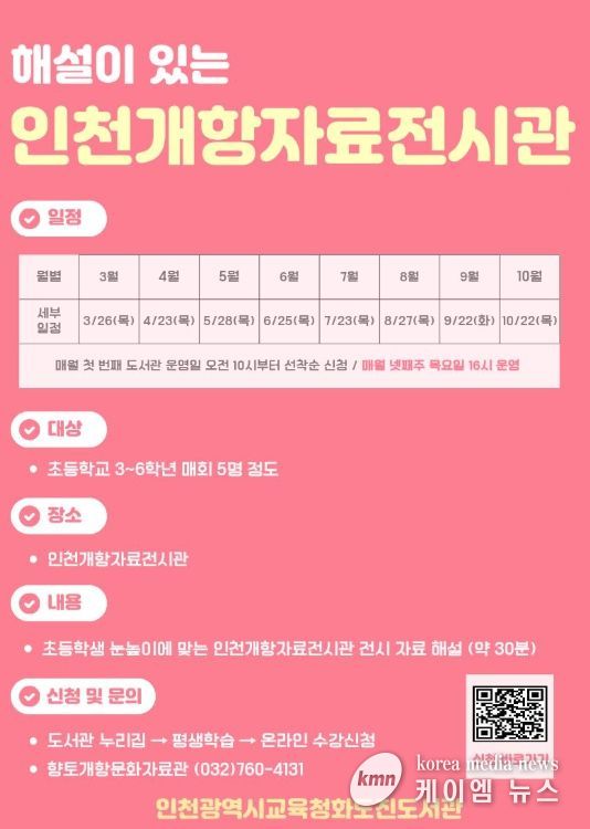 (케이엠뉴스) 인천광역시교육청화도진도서관은 3월부터 10월까지 관내 초등 3~6학년을 대상으로, 향토 문화와 역사의 가치를 알리기 위한 ‘인천개항자료전시관’전시 해설 프로그램을 운영한다.