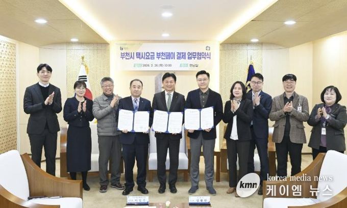 (케이엠뉴스) 부천시는 지난 26일 부천페이 사용처를 교통 분야로 확대하고, 시민의 택시 이용 편의를 높이기 위해 코나아이, 부천개인택시조합과 ‘부천시 택시요금 부천페이 결제 도입’ 업무협약을 체결했다.