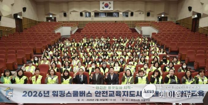 (케이엠뉴스) 부천시는 지난 26일 시청 어울마당에서 ‘2026년 어린이통학안전사업(워킹스쿨버스) 발대식 및 안전교육’을 열고 본격적인 사업 추진에 들어갔다. 이날 행사에는 부천시장을 비롯해 안전교육지도사 117명이 참석했으며, 발대식과 직무교육을 통해 어린이 통학 안전 강화 의지를 공유했다.