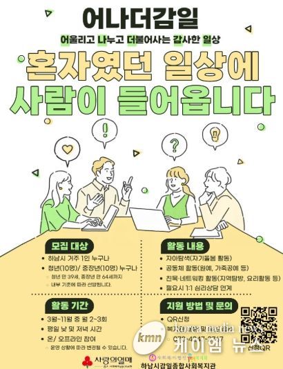 (케이엠뉴스) 하남시감일종합사회복지관(사회복지법인 휴먼복지회 운영)은 2026년 1월부터 12월까지 1인 가구의 사회적 관계망 형성과 지역사회 참여 확대를 위한 특화사업 '어나더 감일(어울리고 나누고 더불어사는 감사한 일상)'을 운영하며 이에 참여할 대상자를 모집한다.