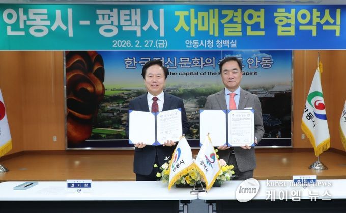 (케이엠뉴스) 경기도 평택시와 경상북도 안동시가 27일, 안동시청에서 자매결연 협약식을 갖고 상호 신뢰와 협력을 바탕으로 행정, 경제, 문화, 관광, 농업 등 다양한 분야의 교류 확대를 약속했다.