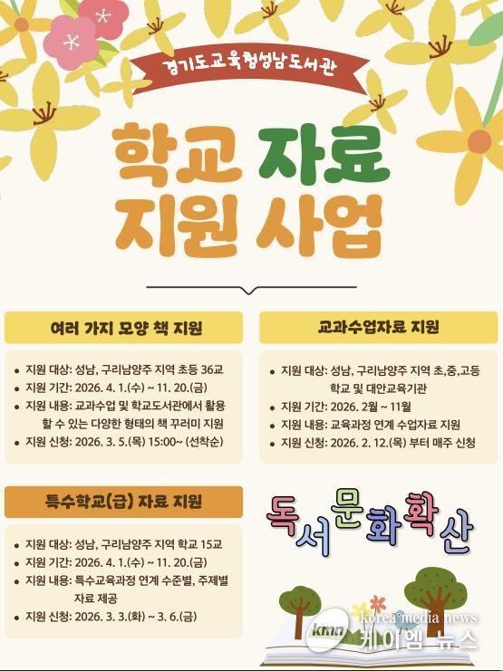(케이엠뉴스) 경기도교육청성남도서관이 성남 및 구리·남양주 지역 학생들의 독서교육을 위해 䃳대 맞춤형 자료 지원 사업’을 운영한다.